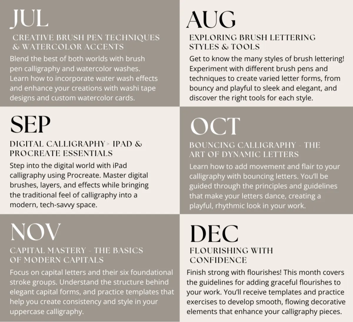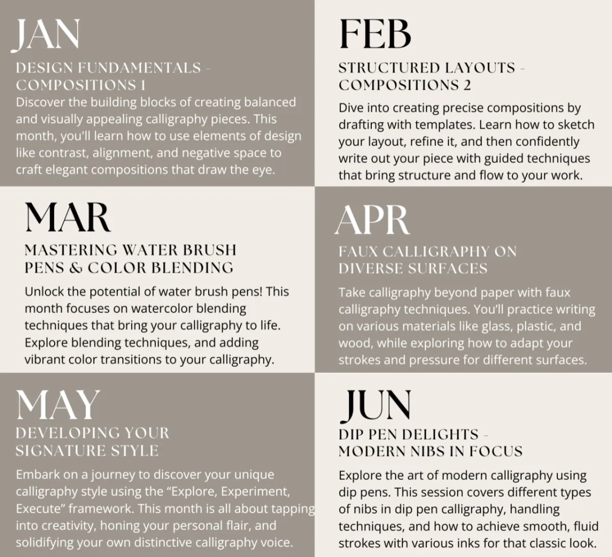 Rather than feeling overwhelmed, you’ll be guided step-by-step in a structured way, learning calligraphy month by month. Each month, you’ll receive training videos and practice resources focused on deepening your understanding of a specific aspect of calligraphy.