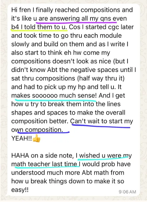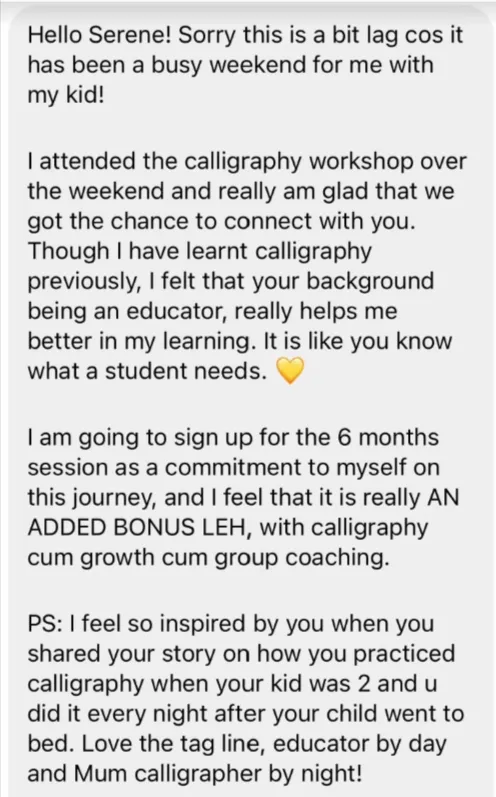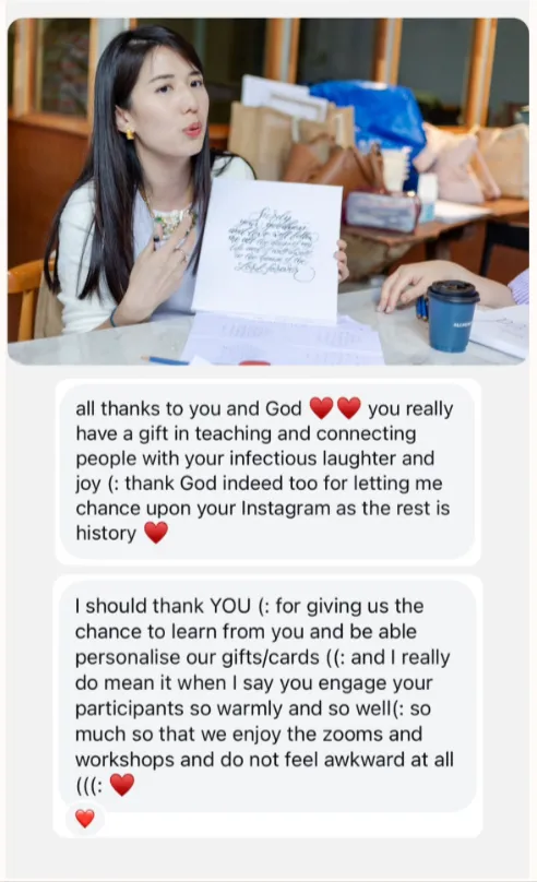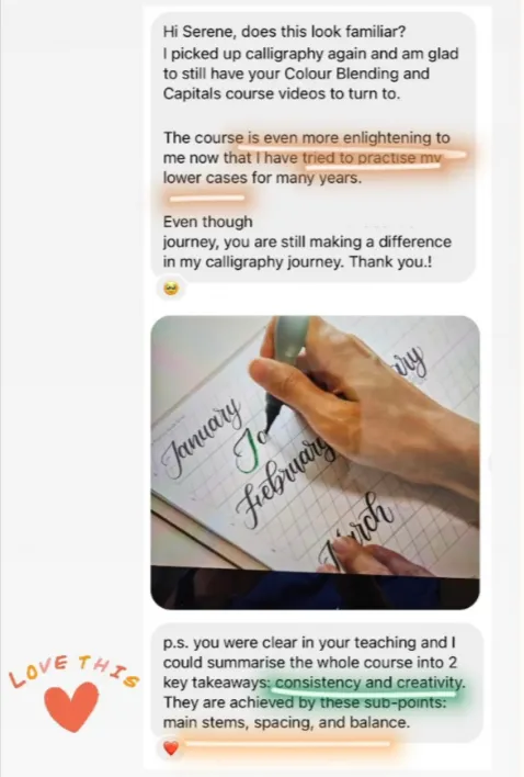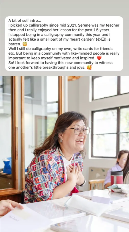 Unlike a typical online course where you work through everything on your own, the Calligraphy Growth Circle (CGC) provides you with hands-on guidance. Serene acts like your "personal trainer," helping you correct strokes and break bad habits to improve your calligraphy.