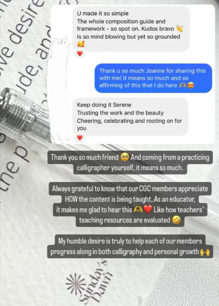 My passion lies in journeying alongside individuals through my Sundays Dawn membership- Calligraphy Growth Circles (CGC), a community of people who are also passionate in personal growth and calligraphy!